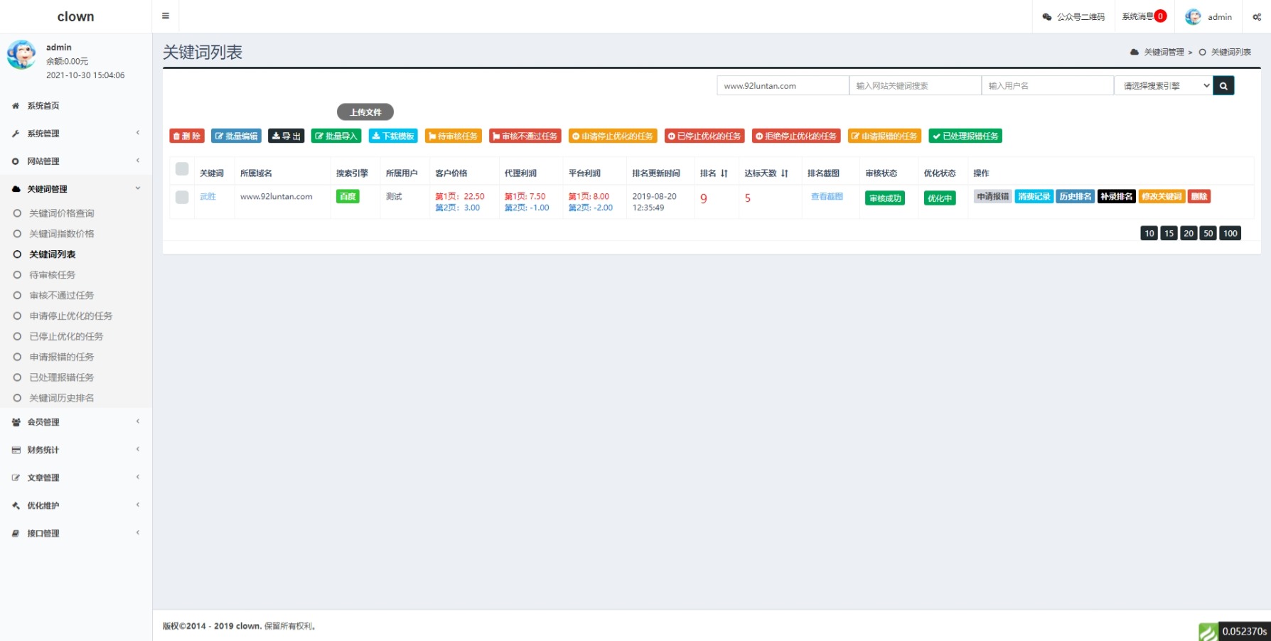 如:域名、网站名称、所属会员、注册时间、关键词数量、达标关键词数量、今日消费、历史消费及网站启用与禁用状态;